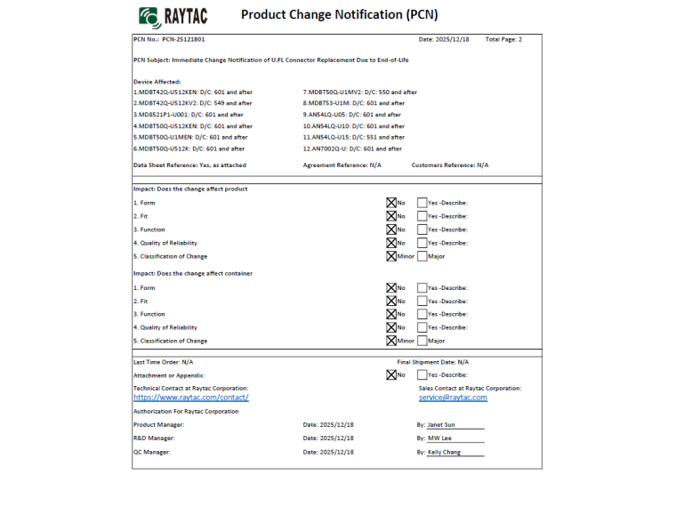 Immediate Raytac Product Change Notice (PCN-25121801) Announcement on u.FL Connector ReplacementImmediate Raytac Product Change Notice (PCN-25121801) Announcement on u.FL Connector Replacement