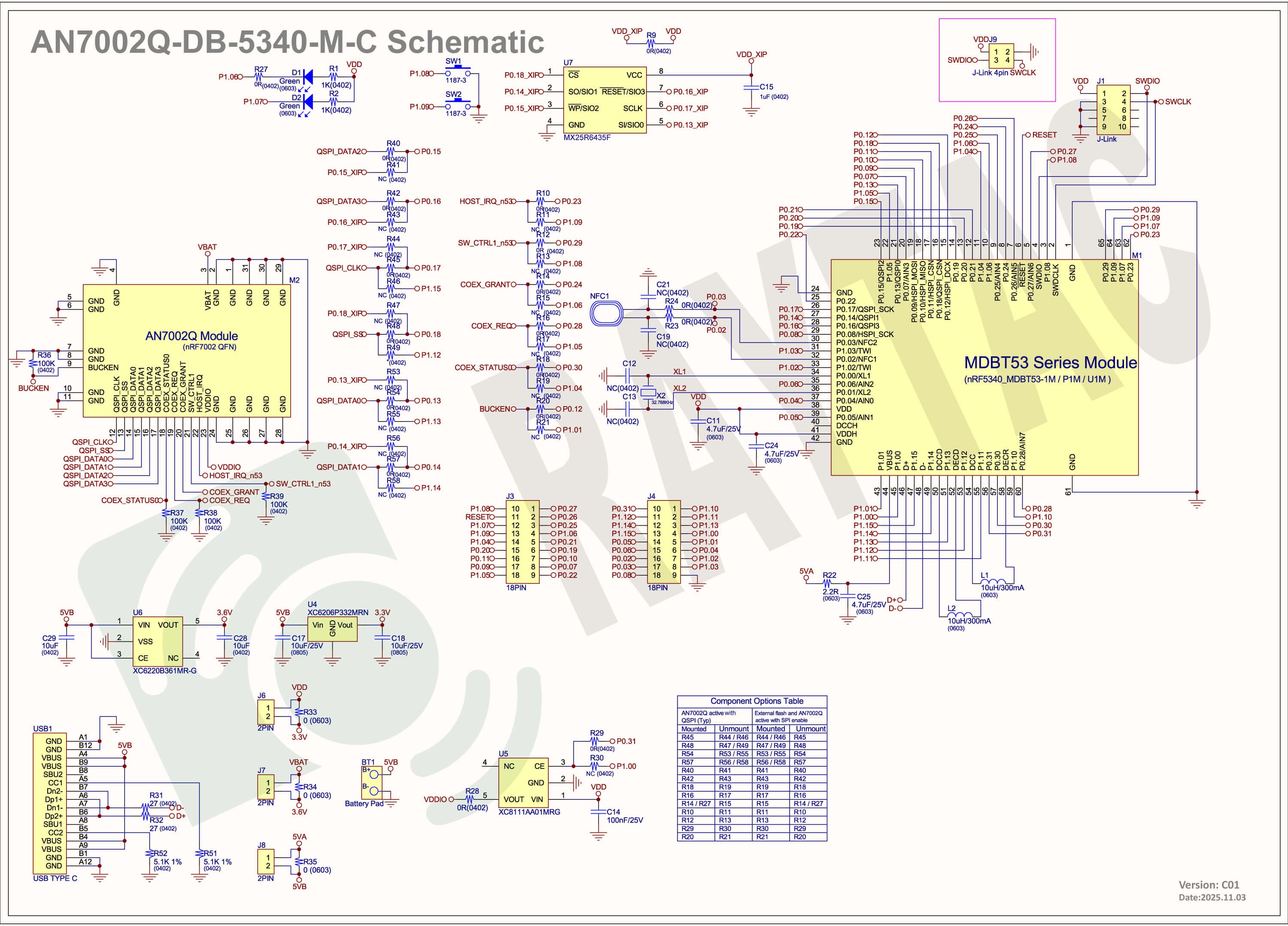 For the PCB design of end product/end device(mounted with AN7002Q & MDBT53 modules), the switch & LED should be configured to be: SW1(p0.23)/SW2(p0.24)/LED1(p0.28).